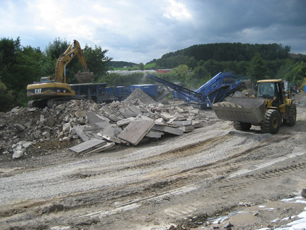 Wir haben die Möglichkeit, durch eine Brech- und Siebanlage die Mauerwerks- und Betonabbruchreste in den verschiedensten Korngrößen aufzubereiten. Diese aufbereiteten Materialien verwenden wir für den Bau von Frostschutz- und Tragschichten